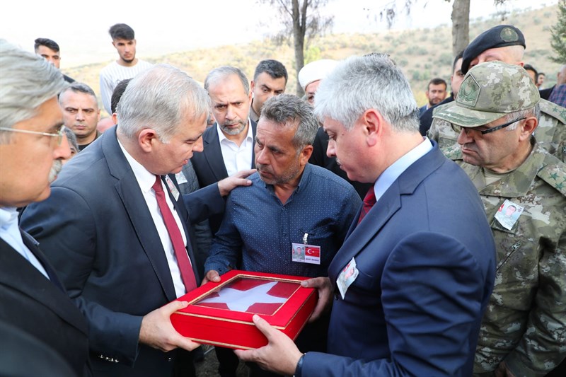 Henüz 23 yaşında ve bekâr olan şehit Piyade Sözleşmeli Er Fırat Güner’in tabutunun sarılı olduğu al bayrağımız Şehidimizin babası Mehmet Güner’e, çerçeveli fotoğrafı ise annesi Nezehet Güner’e, Vali Doğan ile Bakan Yardımcısı Ergüneş tarafından sabır ve başsağlığı temennileriyle teslim edildi. (Haber Merkezi)