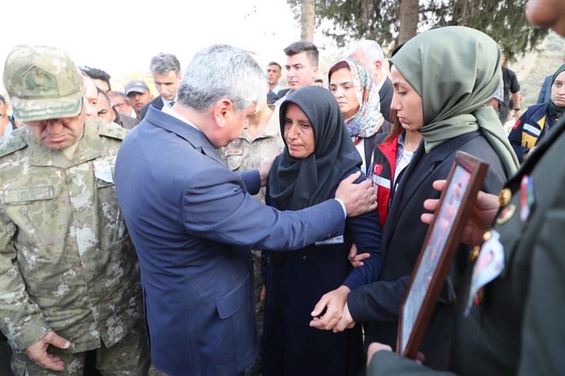 Henüz 23 yaşında ve bekâr olan şehit Piyade Sözleşmeli Er Fırat Güner’in tabutunun sarılı olduğu al bayrağımız Şehidimizin babası Mehmet Güner’e, çerçeveli fotoğrafı ise annesi Nezehet Güner’e, Vali Doğan ile Bakan Yardımcısı Ergüneş tarafından sabır ve başsağlığı temennileriyle teslim edildi. (Haber Merkezi)