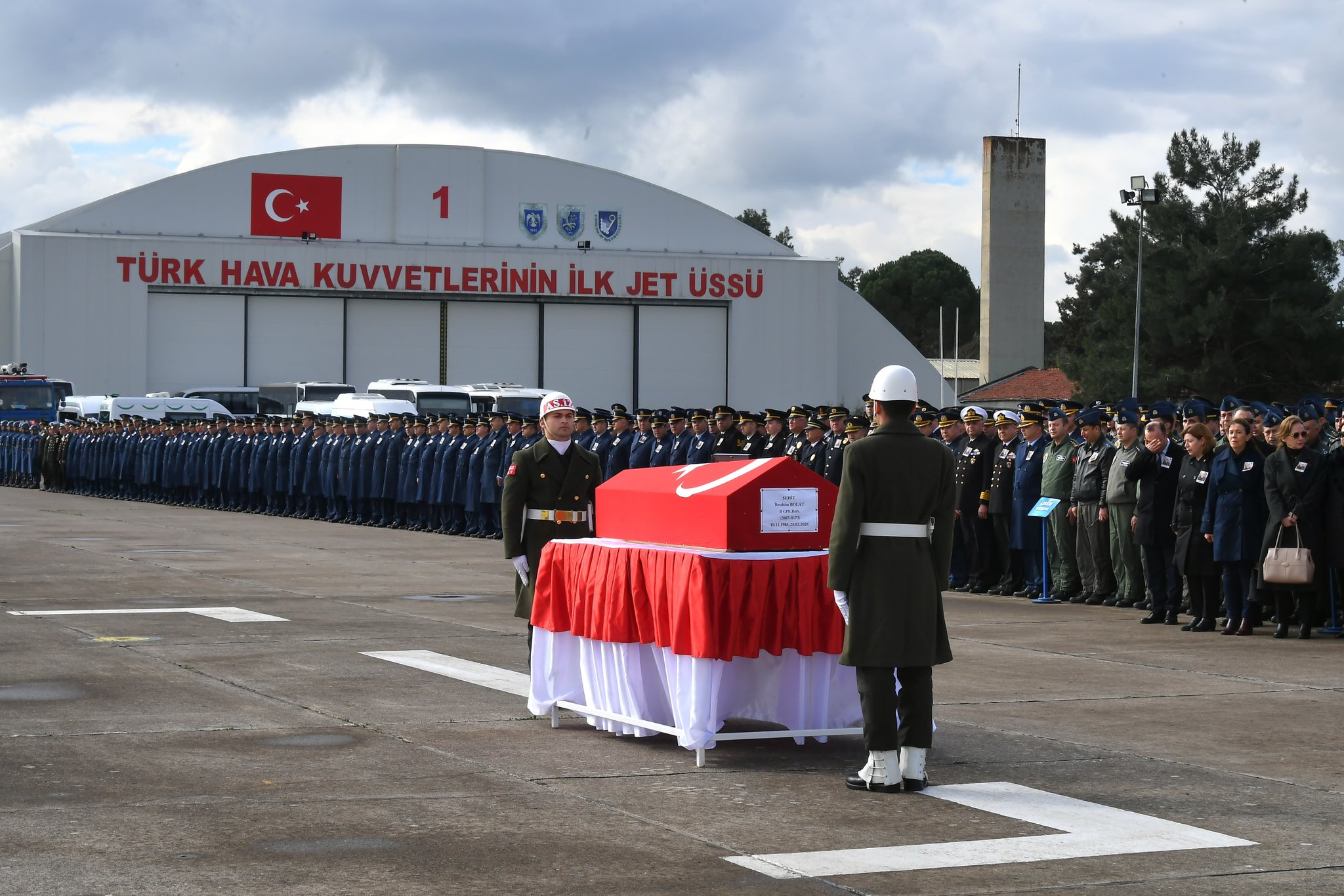 Şehit Binbaşı İbrahim Bolat için 9’uncu Ana Jet Üs Komutanlığı’nda askeri tören düzenlendi. Törende dualar edilirken, şehidin naaşı silah arkadaşlarının omuzlarında askeri uçağa taşındı.
