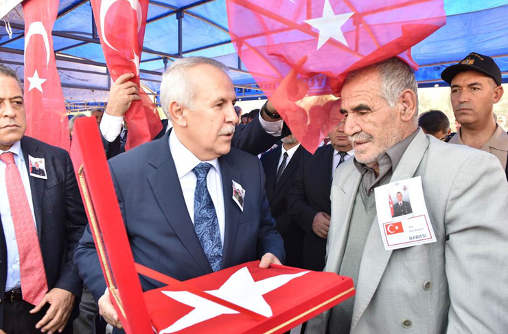 Şehidin ailesini teselli ederek sabır dileyen Vali Ata, şehit Bilal Türkmen’in fotoğrafını ve naaşının sarıldığı Türk Bayrağı’nı da şehidimizin babasına verip başsağlığı diledi.
