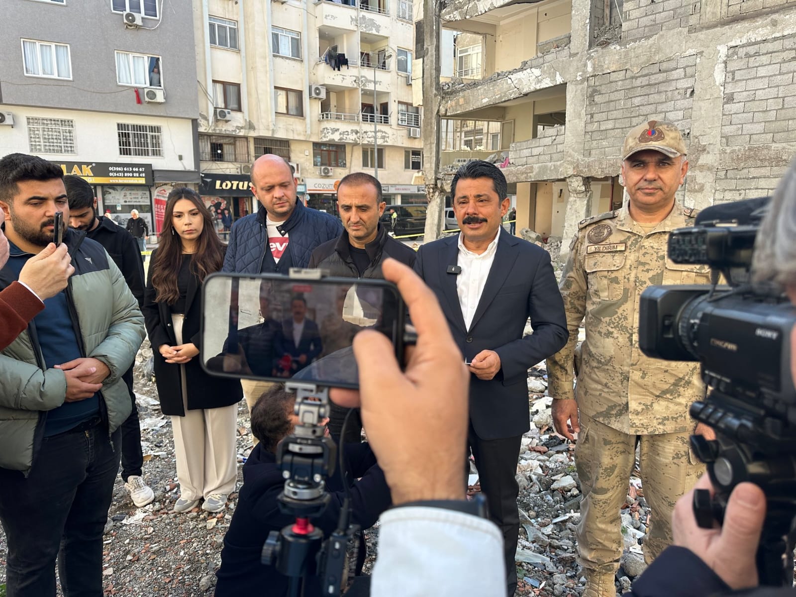 Kaymakam Demiryürek beraberinde Emniyet Müdürü Nevzat Güneş, Jandarma Komutanı Binbaşı Yusuf Yıldırım ve ilgililer ile Kurtuluş Mahallesi, Ziya Gökalp Caddesi üzerinde bulunan, depremde kolonları tamamen parçalanmış ve ayakta güçlükle duran mahkeme tarafından ihtiyati tedbir kararı alınan 5 katlı binanın önünde açıklamalarda bulundu. Mahkeme sürecindeki binaların durumuna dikkat çekmek isteyen Kaymakam Demiryürek, ilçede 588 binanın yıkımları konusunda mahkeme sürecinin devam ettiğini söyledi.