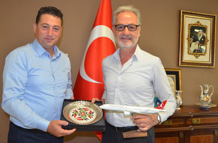 Ziyaretin anısına, THY Hatay Satış müdürü Gürdal, İTSO Başkanı Levent Hakkı Yılmaz’a plaket ve Türk Hava Yollarına ait uçak maketi hediye etti.
