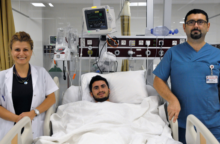 Abdurrahman Eğer’in yaşam fonksiyonlarının, hastaneye getirildiğinde tamamen durduğunu, ancak yapılan müdahalelerle tekrar hayata döndürüldüğünün bilgisini veren Uzm. Dr. Feray Tümkaya; “Hasta, Reyhanlı’dan bilincini kaybetmiş bir şekilde getirilmişti. Bu süreçte beyin fonksiyonlarında meydana gelen hasarı en aza indirebilmek için hastayı bir süreliğine uyuttuk ve solunum desteği verdik. Ardından ilaçlarla uyutmuş olduğumuz Abdurrahman Eğer’in ilaçlarını yavaş yavaş keserek, uyanmasını sağladık. Getirildiğinde durumu ciddi olan hastamız, başarılı müdahalelerle tekrar hayata döndürüldü ve sonrasında iyi bir yoğun bakım ve servis takibi ile sağlığına kavuştu. Sağlık ekibimizin burada yapmış olduğu müdahalenin önemi çok büyük. Bizler de, Abdurrahman’ı sağlığına kavuşmuş bir şekilde taburcu etmenin mutluluğunu yaşıyoruz” açıklamasında bulundu.
