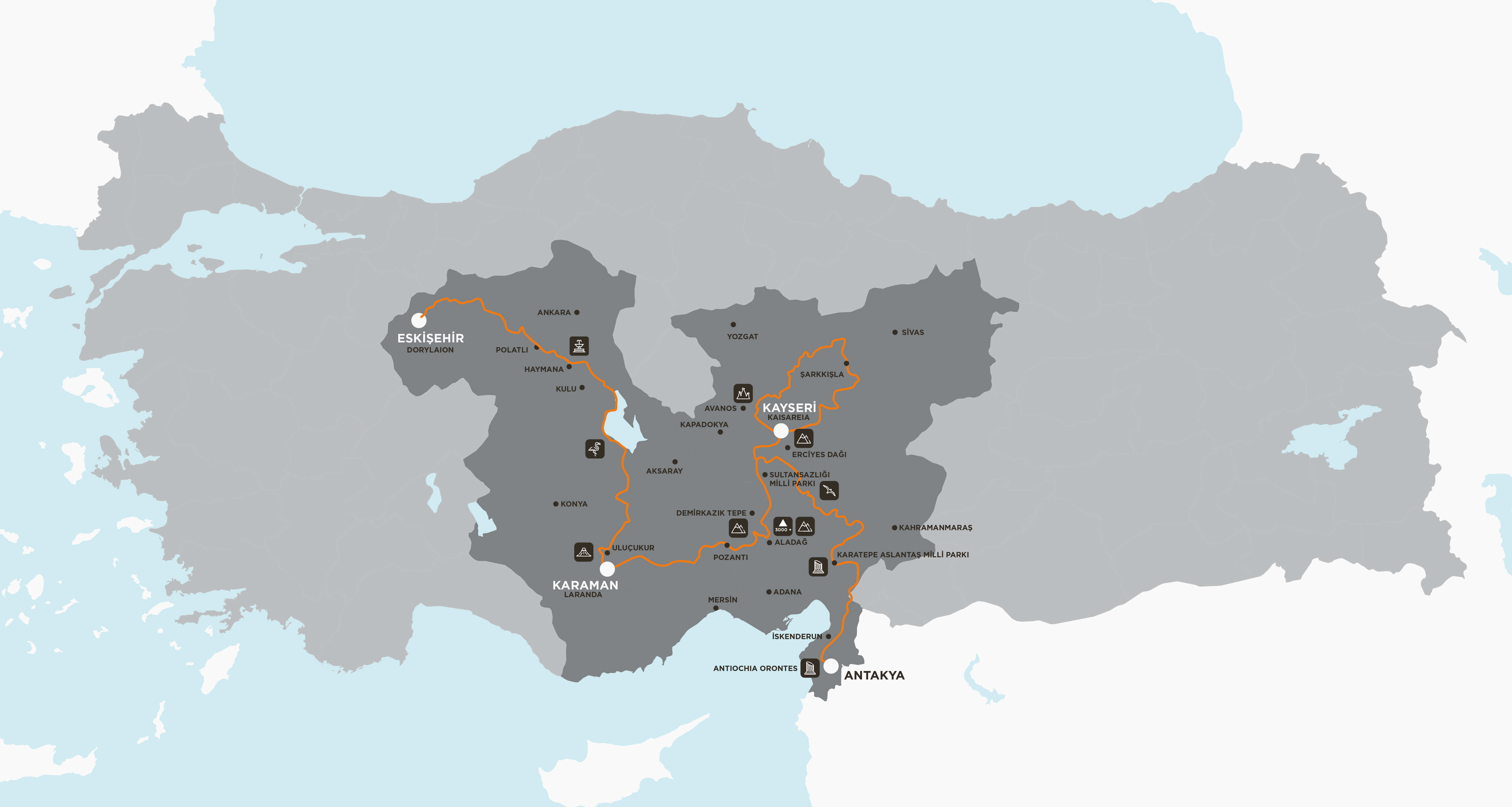 Yarışmacılar 21 Ağustos günü Karatepe Aslantaş Milli Parkı hedefiyle yola çıkıp, bu rota üzerinde Amanos Dağları’nın zirvelerinden geçerek, 2.300 metrelik zirveleri aşıp Kayseri’ye ulaşacak. Yarışın devamında Kayseri’den start alıp, Kayseri’ye geri dönen yarışmacıların diğer günkü hedeflerinde Aladağlar var. Yaklaşık 3.000 metrelik zirveleri geçerek Çiftehan’da termal tesislerin bulunduğu alanda konaklayacak yarışçıları diğer gün Bolkar Dağları’nın zorlu yol koşulları bekliyor olacak. Ardından ise hedef Tuz Gölü. Etabın yüzde 80’ini yolsuz ortamlarda kat edecek yarışmacılar Haymana’daki kamp alanına ulaşacak. Yarışın son günü ise Haymana ve Eskişehir arasında değişik bir coğrafyada ormanlar içinden geçilerek Eskişehir’e varılacak ve yarış son bulacak.