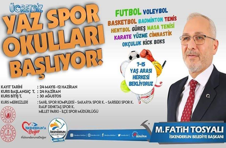 Yaz Spor Okullarıyla çocukların yaz tatillerini en iyi şekilde değerlendirmelerini ve yeteneklerini sergilemelerini amaçladıklarını belirten Başkan Fatih Tosyalı; “Kurslarımız 30 Ağustos’a kadar devam edecek. Sporun ve sporcunun gelişimi için her daim hizmet vereceğiz. Lisanslı spor eğitmenlerimiz eşliğinde futbol, voleybol badminton, tenis, basketbol, hentbol, güreş, masa tenisi, karate, yüzme, jimnastik, okçuluk ve kickboks branşlarında eğitimler ve kurslar verilecek.