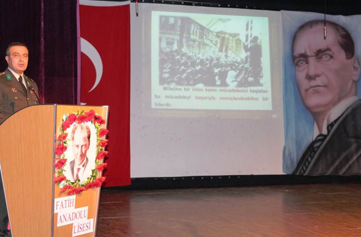 Buradaki törende, saygı duruşu ve İstiklal Marşımızın okunmasının ardından günün anlam ve önemine ilişkin konuşmalar yapıldı. Garnizon Komutanlığı tarafından görevlendirilen bir subay tarafından Atatürk’ün askeri yönünü anlatan bir sunum yapıldı.