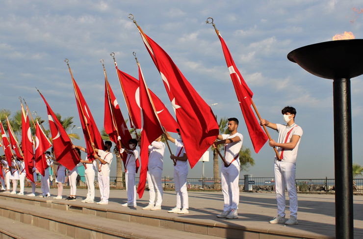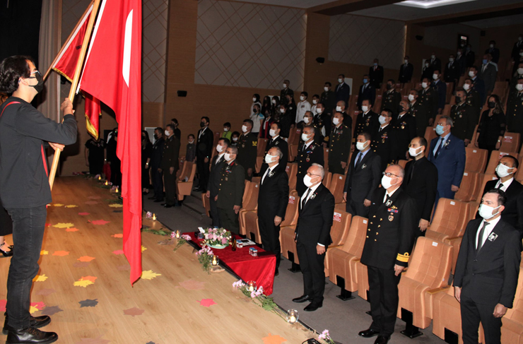 Saatler, Ata’mızın son nefesini verdiği saat olan 09.05’i gösterdiğinde, Ulu Önder Mustafa Kemal Atatürk başta olmak üzere kutsal vatan topraklarımız bütünlüğü ve necip milletimizin selameti adına canlarını feda ederek şehadete intikal eden tüm aziz şehitlerimiz anısına sivil savunma sirenlerinin eşliğinde iki dakika saygı duruşunda bulunularak, İstiklal Marşımız okundu.