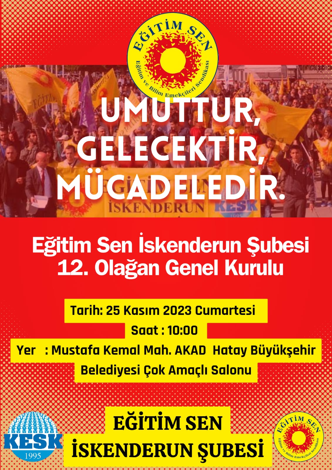 Eğitim ve Bilim Emekçileri Sendikası (Eğitim Sen) İskenderun Şubesi, 25 Kasım 2023 Cumartesi Günü, 12. Olağan Kongresini gerçekleştirecek.