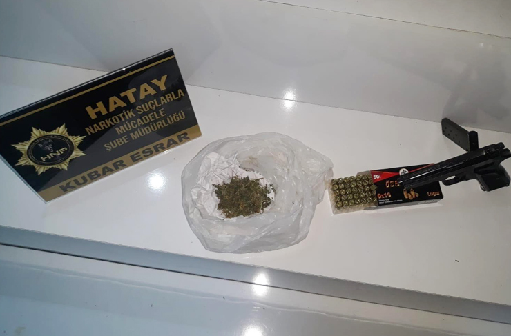 Defne ilçesinde yapılan bir operasyonda ise O.K. isimli şahsın Harbiye Mahallesinde bulunan ikametinde yapılan aramada; 8 gram Kubar Esrar maddesi, 9.19 mm çapında ‘Pietro Beretta’ ibareli 1 adet tabanca, tabancaya ait 1 adet şarjör ile 9,19 mm çapında 37 adet fişek ele geçirildi. Yakalanan O.K. emniyete getirilerek hakkında adli işlem yapıldı.