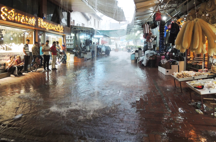 Tarihi Antakya Uzun Çarşı bir saat yağmur ve dolu yağması sonucu seller altında kaldı. Tarihi uzun çarşının tam bayram arifesinde suların altında kalması esnafı ve alışveriş yapmaya gelen vatandaşları zor durumda bıraktı. Esnaflar, her esnafın 4-5 bin lira zararı olduğunu belirtti.