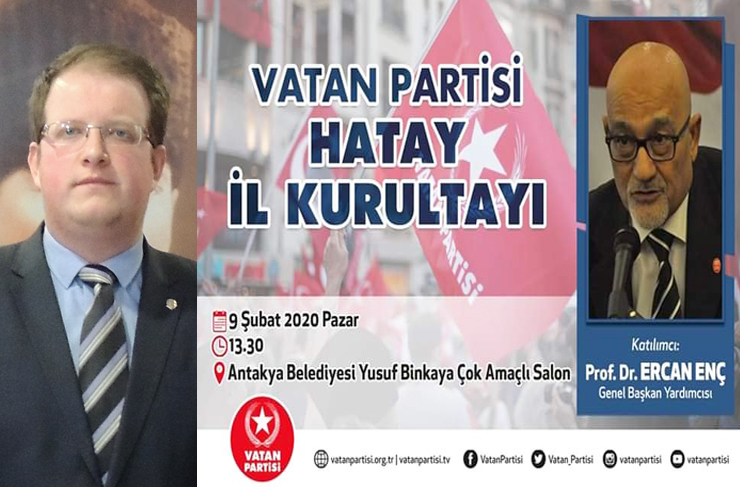 Vatan Partisi Hatay il kurultayı, 9 Şubat 2020 Pazar günü, saat 13.30’de Antakya Belediyesi Yusuf Binkaya çok amaçlı salonda yapılacaktır. Hatay il kurultayı önemlidir ve üyelerimizin katılması gerekiyor.