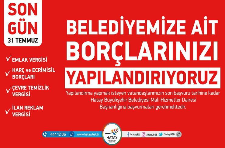 Hatay Büyükşehir Belediyesi(HBB) Mali Hizmetler Daire Başkanlığı, 7143 sayılı Vergi ve Diğer Bazı Alacakların Yeniden Yapılandırılmasına İlişkin Kanun kapsamında Hatay Büyükşehir Belediyesine borcu olan mükelleflere çağrıda bulundu.