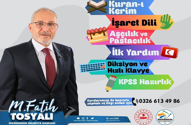 İskenderun Belediye Başkanı Fatih Tosyalı, kültür müdürlüğü tarafından devam eden ücretsiz kurslara yenilerinin eklendiğini belirtti. Daha önce açılan el sanatları kurslarının yoğun ilgi gördüğünü ifade Başkan Fatih Tosyalı; “Kültür ve Sosyal İşler Müdürlüğümüz tarafından devam eden ücretsiz kurslarımıza yenilerini ekledik. Çeşitli branşlarda açılan yeni kurslarımız hakkında ön başvuru yapmak ve bilgi almak için 0 326 613 49 86 numaralı telefonlarımızı arayabilirsiniz” dedi.