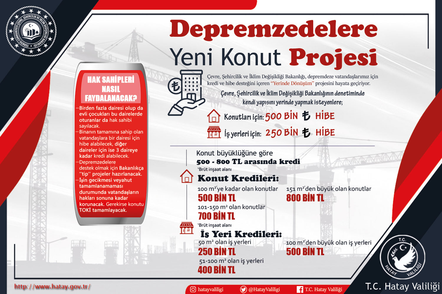 17 Temmuz’da hayata geçirilen proje ile depremzedelere, konut ve işyerlerini Bakanlığın denetiminde yerinde yapmaları için hibe ve kredi desteği imkanı sunulacak. Konutlar için 500 bin TL, işyerleri için ise 250 bin TL hibe verilecek. Konut büyüklüklerine göre 500 bin TL ile 800 bin TL arasında ve işyeri büyüklüklerine göre de 250 bin TL ile 500 bin TL arasında da kredi kullanabilecek.