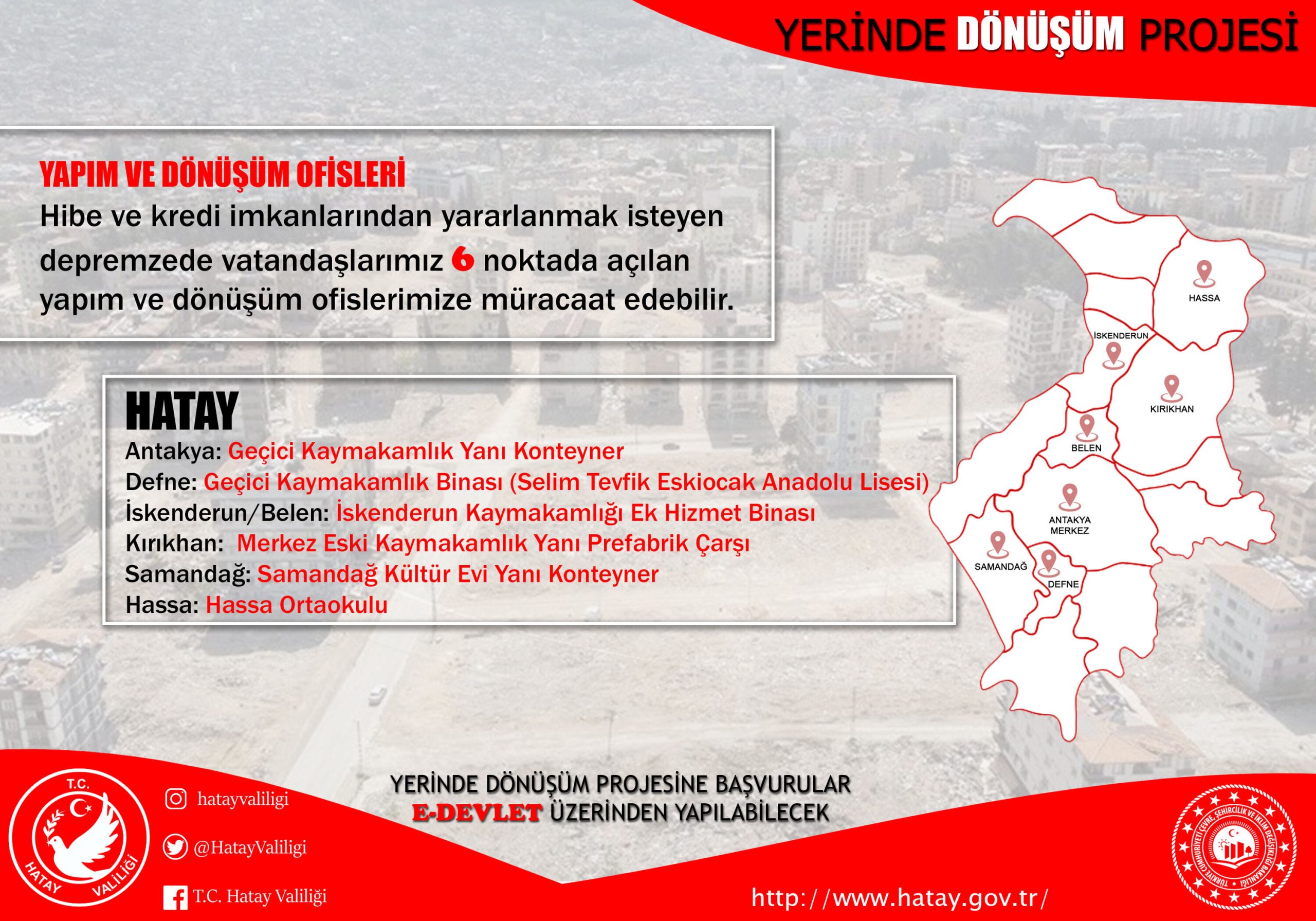 Yapım ve Dönüşüm Ofisleri, depremden etkilenen ilimizde 17 Temmuz’dan itibaren; Antakya, Defne, İskenderun/Belen, Kırıkhan, Samandağ ve Hassa olmak üzere 6 noktada hizmet vermeye başlamıştır.