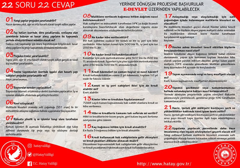 Yerinde Dönüşüm projesiyle deprem bölgesinde yaraların daha hızlı sarılması için Bakanlığın denetiminde yerinde dönüştürülecek konutlara 500 bin TL hibe, 500 bin TL kredi; işyerlerine ise 250 bin TL hibe, 250 bin TL de kredi desteği verileceğini açıkladı. Krediler, 2 yılı ödemesiz 10 yıl vade ve sıfır faizle kullandırılacak. Başvurular ‘e-Devlet’ üzerinden yapılacak. Vatandaşlar, Çağrı Merkezi ALO 181’den Yerinde Dönüşüm projesiyle ilgili bilgi alabilecek.