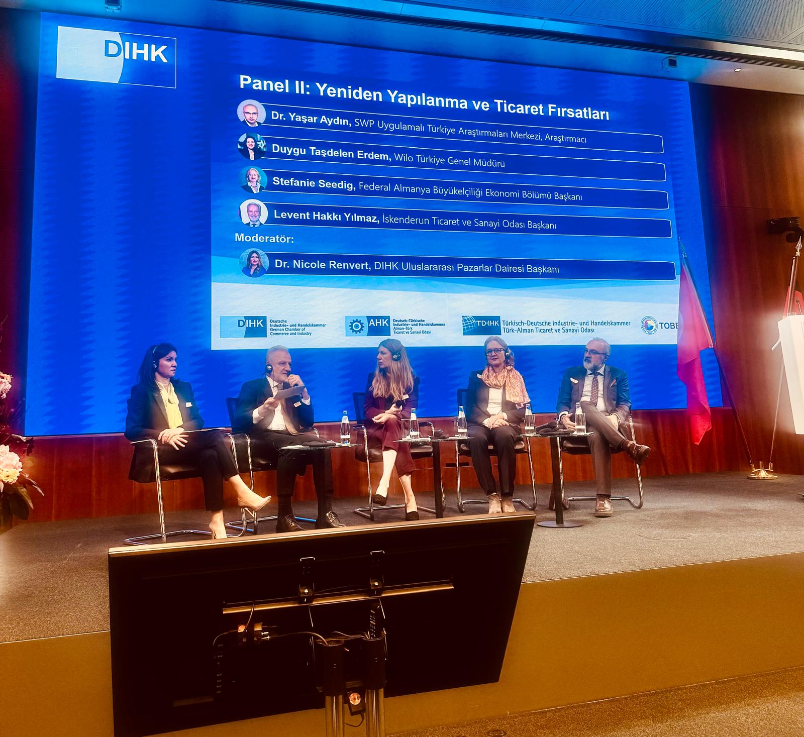 TD-IHK Genel Kurulu’nun ardından gerçekleştirilen panelin moderatörlüğünü DIHK Uluslararası Pazarlar Dairesi Başkanı Dr. Nicole Renvert üstlendi. Panelde; SWP Uygulamalı Türkiye Araştırmaları Merkezi’nden Dr. Yaşar Aydın, Wilo Türkiye Genel Müdürü Duygu Taşdelen Erdem, Federal Almanya Büyükelçiliği Ekonomi Bölümü Başkanı Stefanie Seedig ve İTSO Yönetim Kurulu Başkanı Levent Hakkı Yılmaz konuşmacı olarak yer aldı.