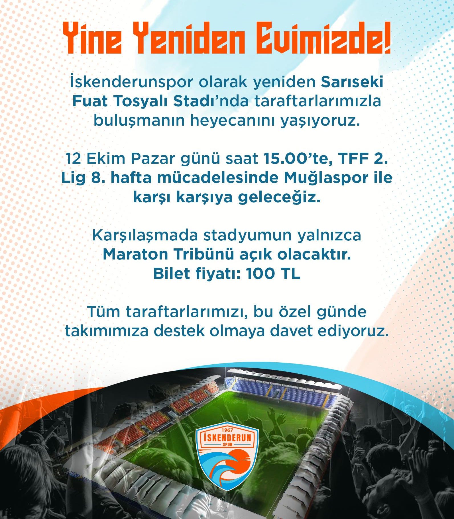 Türkiye Futbol Federasyonu (TFF) İskenderunspor-Muğlaspor maçının Fuat Tosyalı Stadında oynanacağını açıklaması üzerine konuyla ilgili Turuncu-Mavili kulüpten de yazılı bir açıklama geldi. Sosyal medya üzerinden yapılan açıklamada, sadece Maraton Tribünün açılacağının altı çizilirken; “İskenderunspor olarak yeniden Sarıseki Fuat Tosyalı Stadı’nda taraftarlarımızla buluşmanın heyecanını yaşıyoruz. 12 Ekim Pazar günü saat 15.00’te, TFF 2. Lig 8. hafta mücadelesinde Muğlaspor ile karşı karşıya geleceğiz.