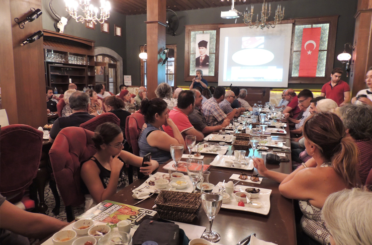 Yükselen devletlerin artık inişe geçmeye başladığı dönemi ve tarihini yazandır bu coğrafya. Çok insan bunu anlamakta zorlanabilir ama bugün birçok devletin kavgasına, rekabetine maruz kalandır bu coğrafya. Rusya, Amerika, İsrail, dünya burası için savaşıyor, buranın kıymetini biliyor ama biz kendi kıymetimizi bilmiyoruz. Toprağımız çok verimli. Ne ekerseniz ekin, en güzel şekilde alıyorsunuz. Tütün, pamuk bizim ürünümüz değildi ama ekildi ve en kaliteli ürünler elde edildi. Bu bölge zengin bir enginar coğrafyasıdır. Mustafa Kemal enginarını Dörtyol’da getirtirdi ama şimdi Dörtyol’dan Samandağ’a kadar olan coğrafyada bir enginar ağacı göremezsiniz” diyerek Hatay, Suriye, İran, Irak ve hatta daha geniş bölgeleri içine alan bu coğrafyayı eski ve yeni haritaları göstererek doğru telaffuzlarla anlattı.