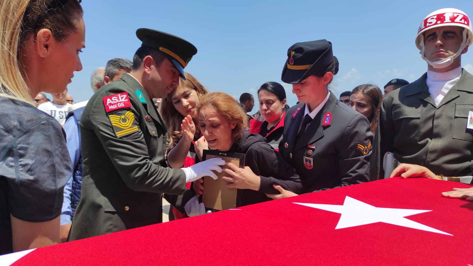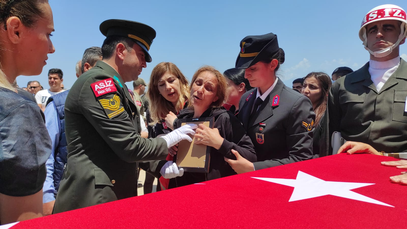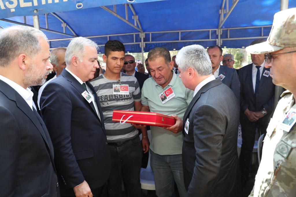 Vali Rahmi Doğan, Aile ve Sosyal Hizmetler Bakan Yrd. İsmail Ergüneş, şehidimizin naaşının üzerine örtülen Türk Bayrağını babası Erkan Kapılay’a teslim ettiler.