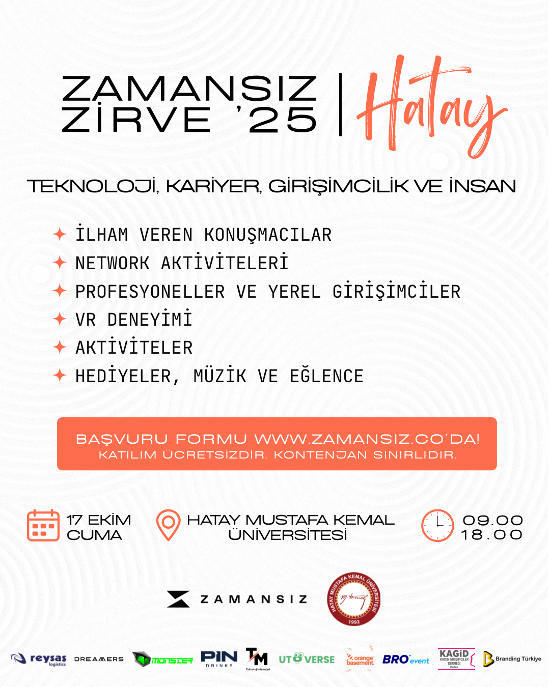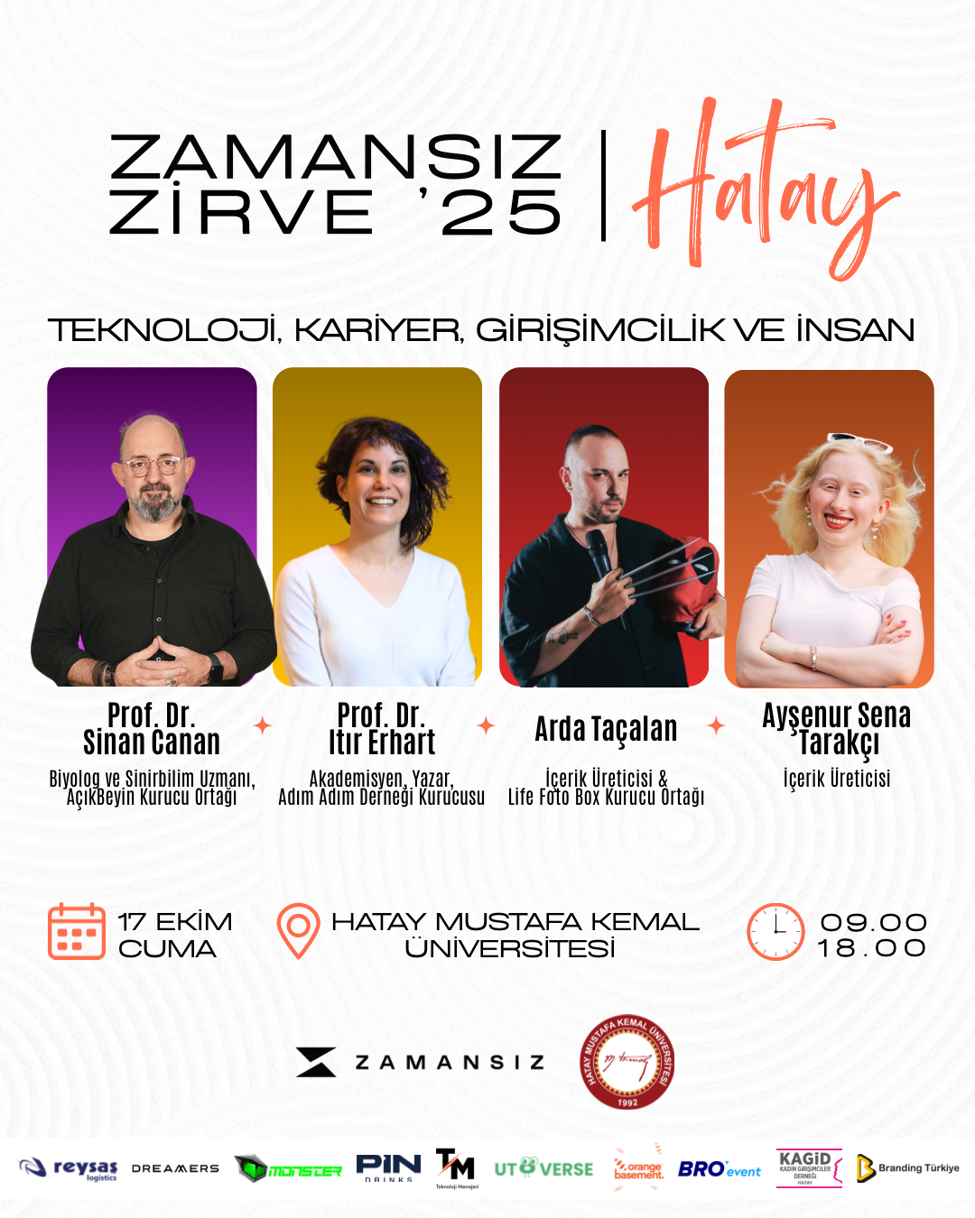 Kuşaklar arası iletişimi güçlendirmeyi, deneyim aktarımını desteklemeyi ve ilham verici buluşmalar yaratmayı hedefleyen Zamansız, bu yılki büyük zirvesini Hatay Mustafa Kemal Üniversitesi ev sahipliğinde gerçekleştiriyor. Zamansız Zirve’25, 17 Ekim 2025 Cuma günü Hatay Mustafa Kemal Üniversitesi, Atatürk Konferans Salonu’nda; gençler, profesyoneller ve alanında öncü isimlerin buluştuğu, dopdolu ve etkileşimli bir etkinlik olarak katılımcıları bekliyor.